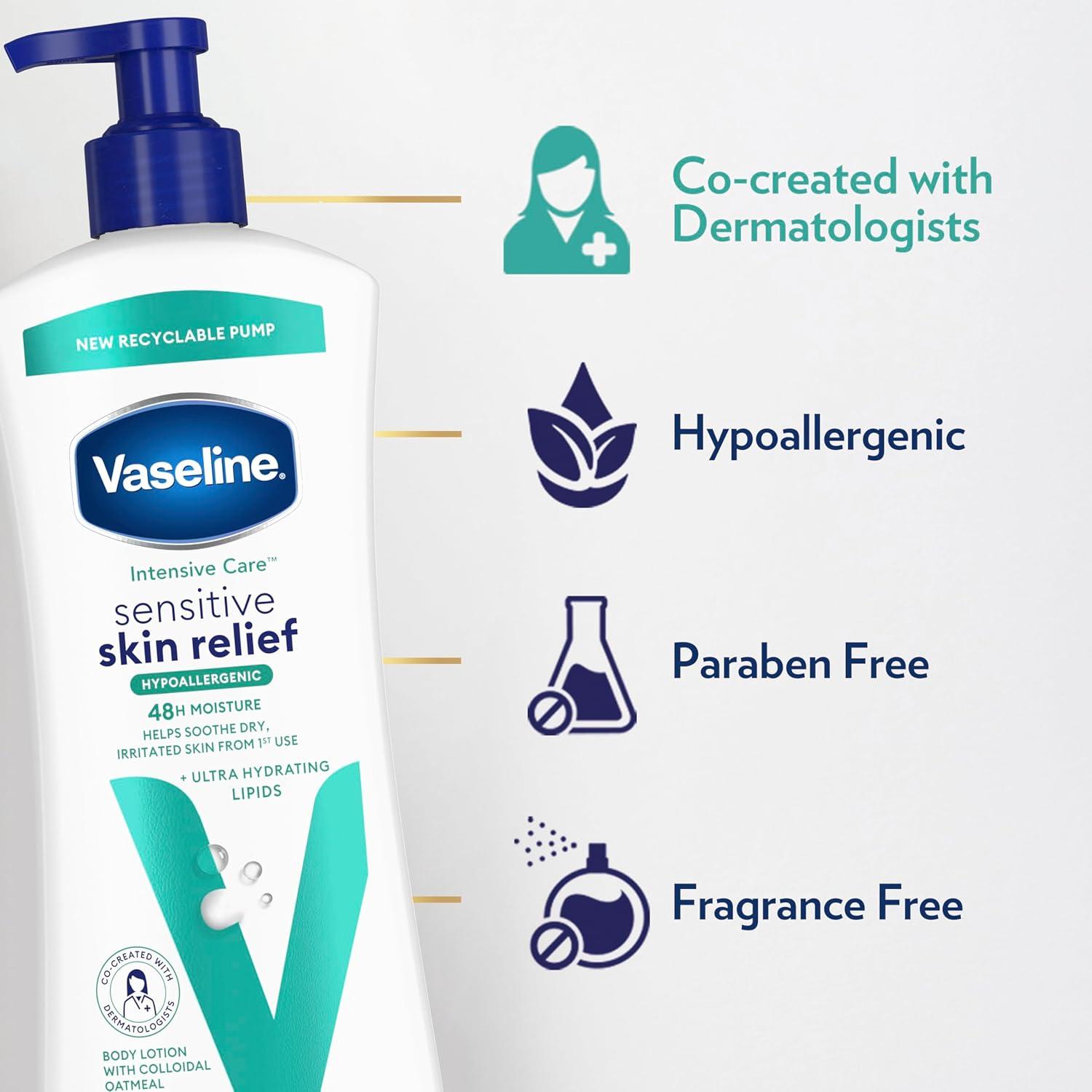 DAILY SKIN CARE: Use Vaseline Intensive Care Sensitive Skin Relief Body Lotion as your daily body lotion for sensitive, dry, and irritated skin. Just apply to your skin for hydrating relief