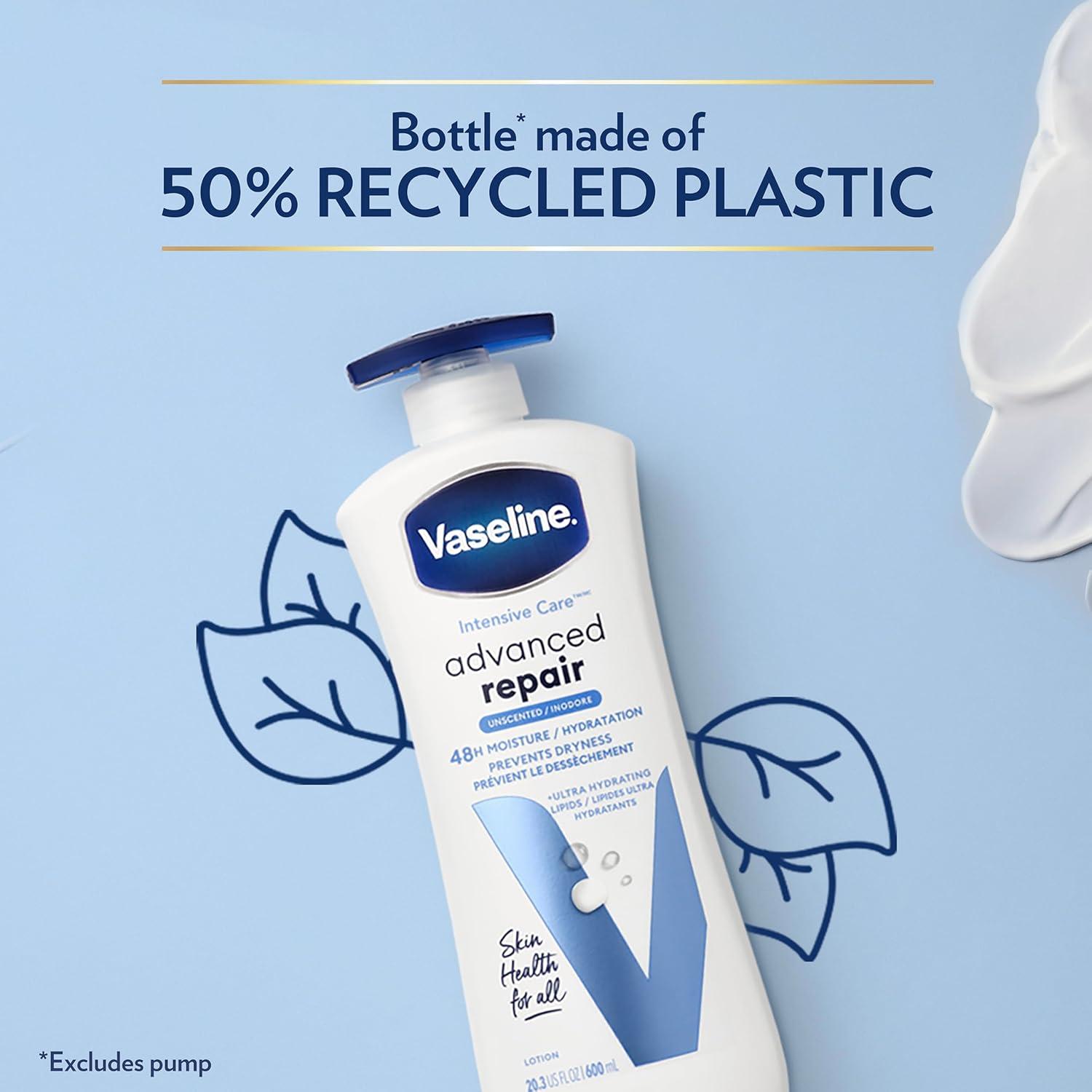 Made with Vaseline Jelly and Ultra-Hydrating Lipids, Vaseline Intensive Care Advanced Repair Unscented Body Lotion for dry skin prevents dryness and helps keep your skin looking healthy and hydrated. With daily exposure to environmental triggers (like wind, lack of humidity, and sun), skin's natural moisture barrier can break down, allowing water to escape the skin. But the Ultra-Hydrating Lipids in our Advanced Repair Lotion fortify the skin barrier and replenish moisture to allow the skin's natural barrier to recover. Vaseline Intensive Care Advanced Repair Unscented Lotion, formulated with Ultra-Hydrating Lipids and Vaseline Jelly, locks in moisture and repairs extremely dry skin. This unscented body moisturizer is clinically tested to provide 90% more moisture (vs. untreated skin). This lotion for dry skin absorbs fast for rich moisturization without feeling greasy and provides 48-hour moisture. Use this dermatologist-tested body lotion daily on dry, rough skin for stronger, noticeably healthier skin. Just apply to your skin for long-lasting moisture. This lotion bottle is made of 50% recycled plastic. Our ambition is to get to 100% recycled plastic in the near future. Since 2018, we've used 337 Metric Tons of recycled plastic across the Vaseline product portfolio in North America.