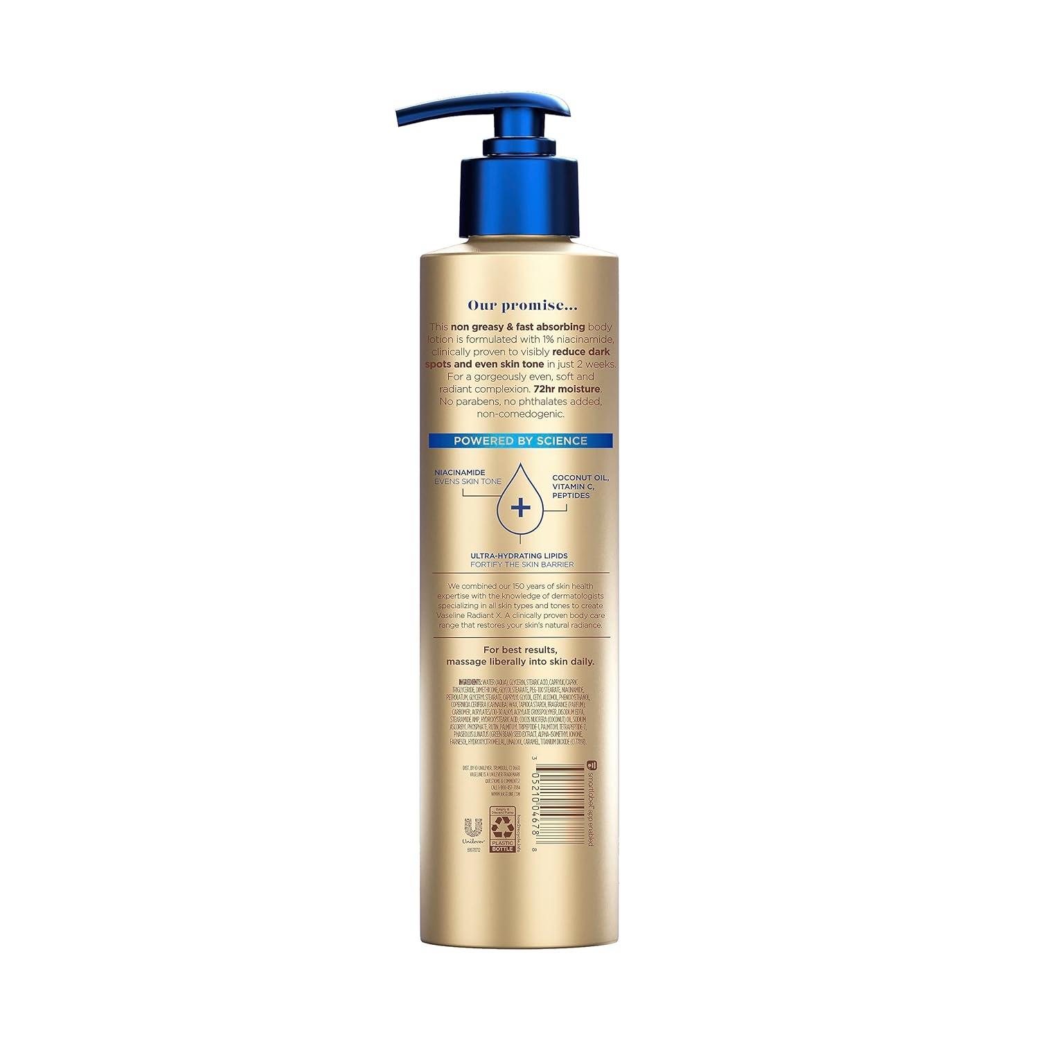 Vaseline Radiant X Even Tone Nourishing Body Lotion is a clinically proven lotion that visibly reduces dark spots and evens skin tone in just 14 days. It contains 1% niacinamide, coconut oil, vitamin C, peptides, and ultra-hydrating lipids that fortify the skin barrier. Co-created with dermatologists, it restores skin's natural radiance. With a 72hr moisture range, it is free of parabens, phthalates, and is non-comedogenic. For best results, apply Vaseline Radiant X Even Tone Nourishing Body Lotion liberally to your skin daily and massage. For extra hydration and glow, add a few pumps of the Vaseline Radiant X Replenishing Hydrating Body Oil. Vaseline combined 150 years of its skin health expertise with the knowledge of dermatologists specializing in all skin types and tones to create Vaseline Radiant X. A clinically proven body care range designed to restore your skin’s natural radiance. Discover the range of products: • Vaseline Radiant X Even Tone Nourishing Body Lotion • Vaseline Radiant X Deep Nourishment Hand Butter • Vaseline Radiant X Deep Nourishment Body Cream • Vaseline Radiant X Replenishing Hydrating Body Oil. At Vaseline, we believe skin health is essential for well-being. That’s why Vaseline is working towards giving everybody, everywhere, access to the skin care they need.